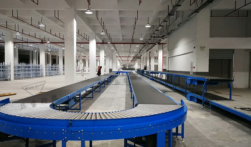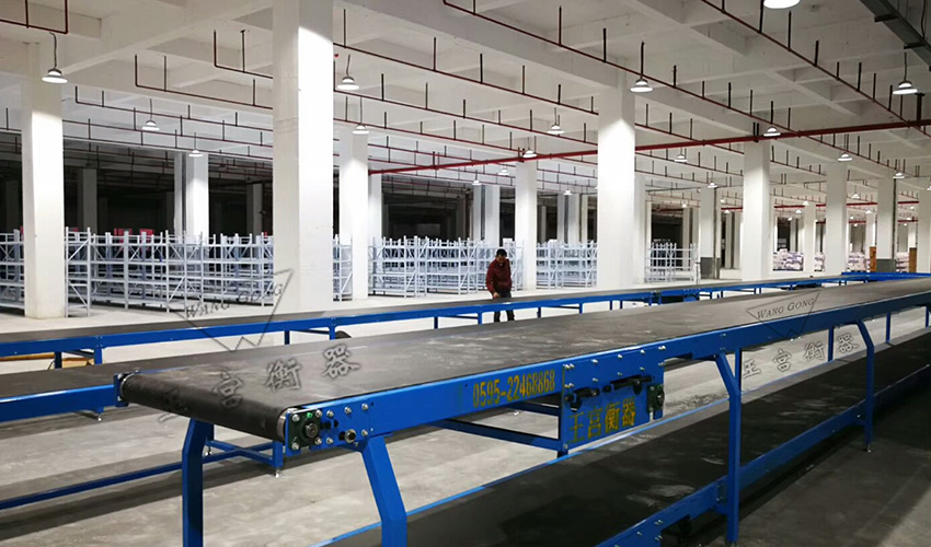王宫衡器物流输送系统:是由平面式皮带机、滚筒转弯机、滑槽、输送皮带、机架体、电气控制系统等组成,用于各种分配线,输送线,包装线作业尤其是快递物流分拣中心。